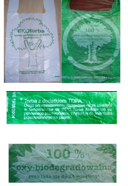 Przykłady toreb z folii PE-HD wytworzonej z wymienionymi dodatkami przedstawiono na fot. 7-11. Informację identyfikującą materiał oraz zastosowany dodatek można znaleźć na torbie zamieszczonej na rys. 7. (informacja nie wprowadza w błąd), natomiast nadruk na torbie na rys. 8-11, może już skłonić niektórych konsumentów do wyrzucenia toreb do lasu, bo przecież są one przyjazne środowisku czy „zaczną znikać". Niekiedy są one reklamowane jako torby oksodegradowalne, lub oksobiodegradowalne, jakby ten termin świadczył o szczególnych korzyściach dla środowiska.